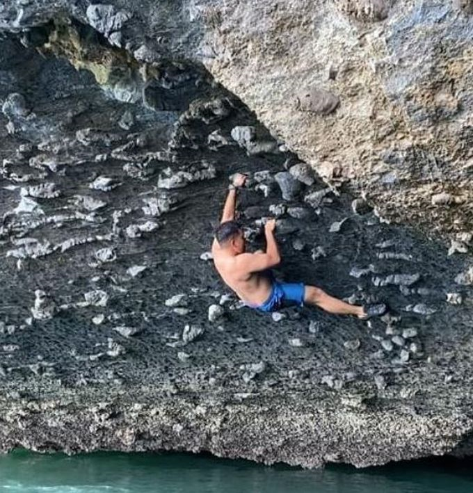 Mandi di kali dekat batu, ada orang sedang memancing.